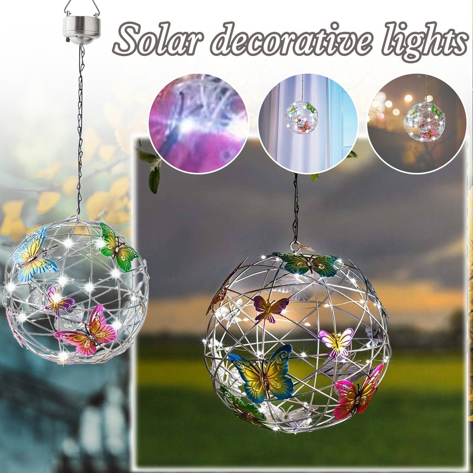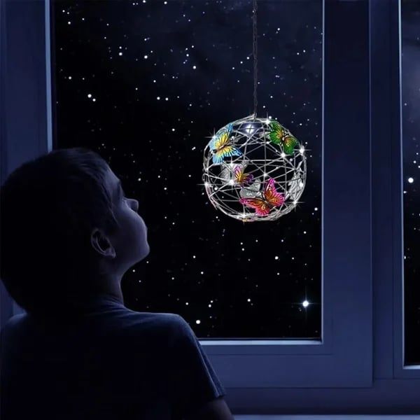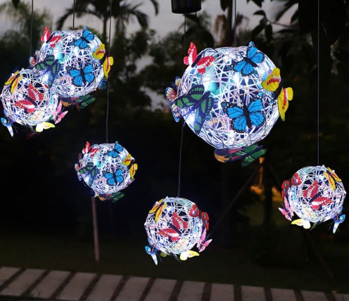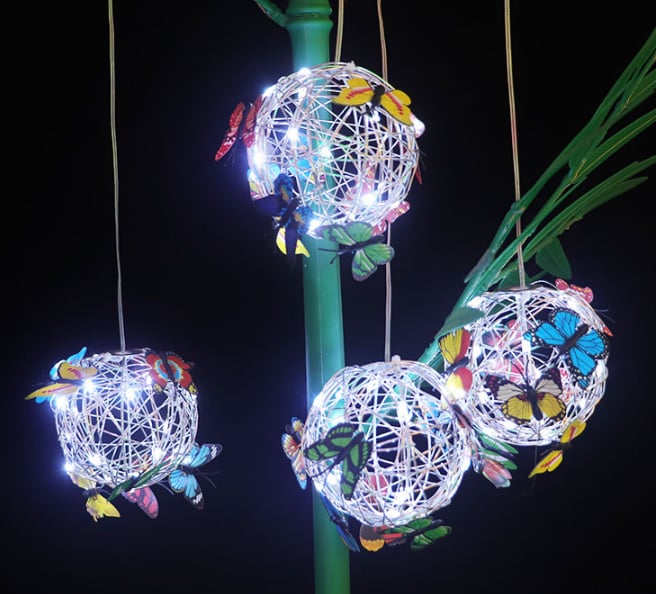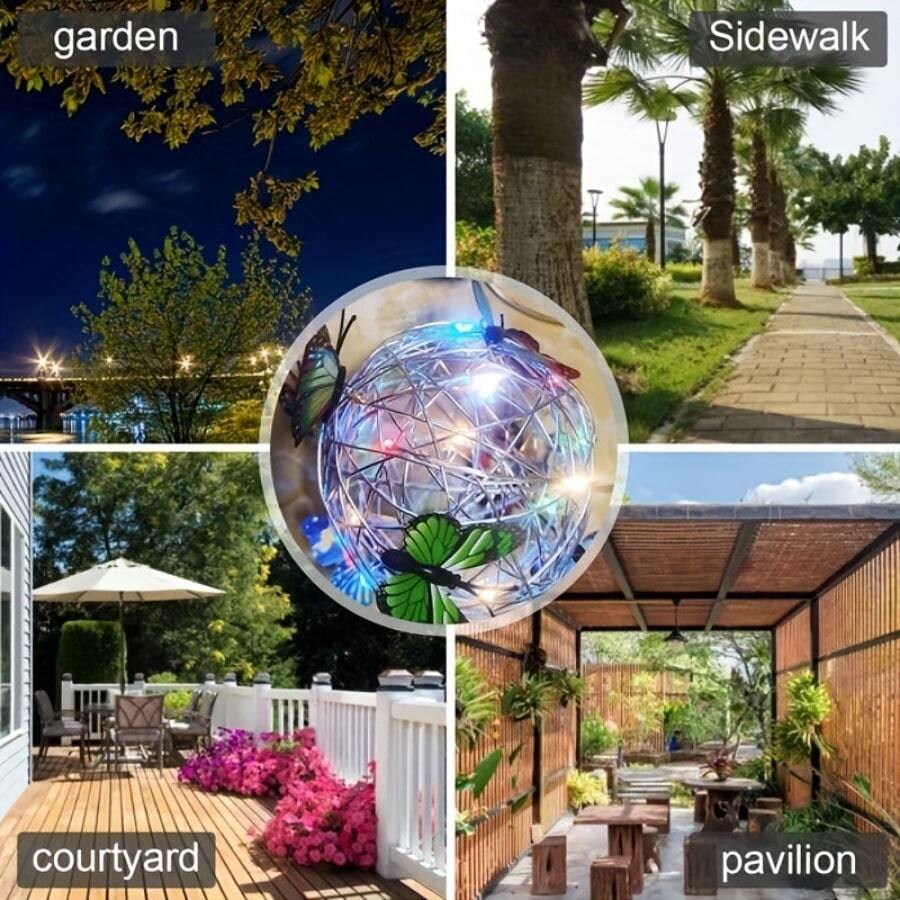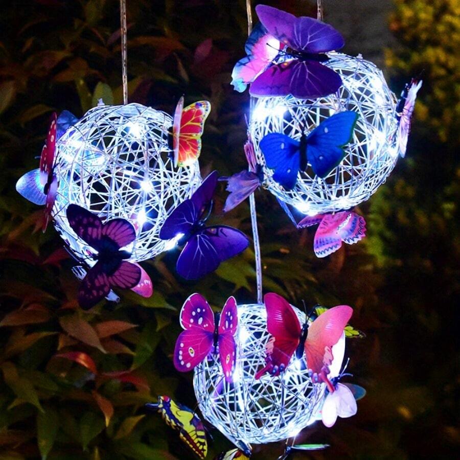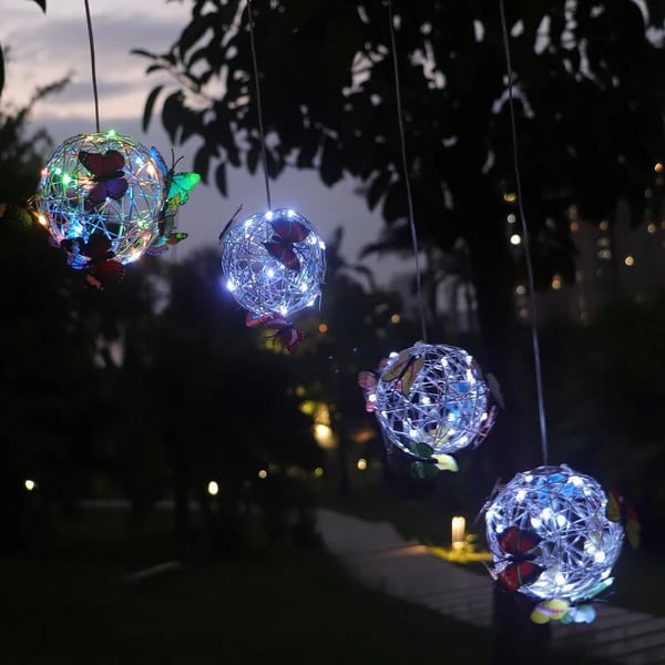 - Върху металната топка има модели на пеперуди в различни цветове, след като се стъмни, низ от светлини осветява нощта, този специален дизайн ще създаде романтична атмосфера и ще обогати радостната ви атмосфера вътре и извън къщата Мир и красота. Използвайте тези светлини като парти, сватбена декорация или градинско парти.
