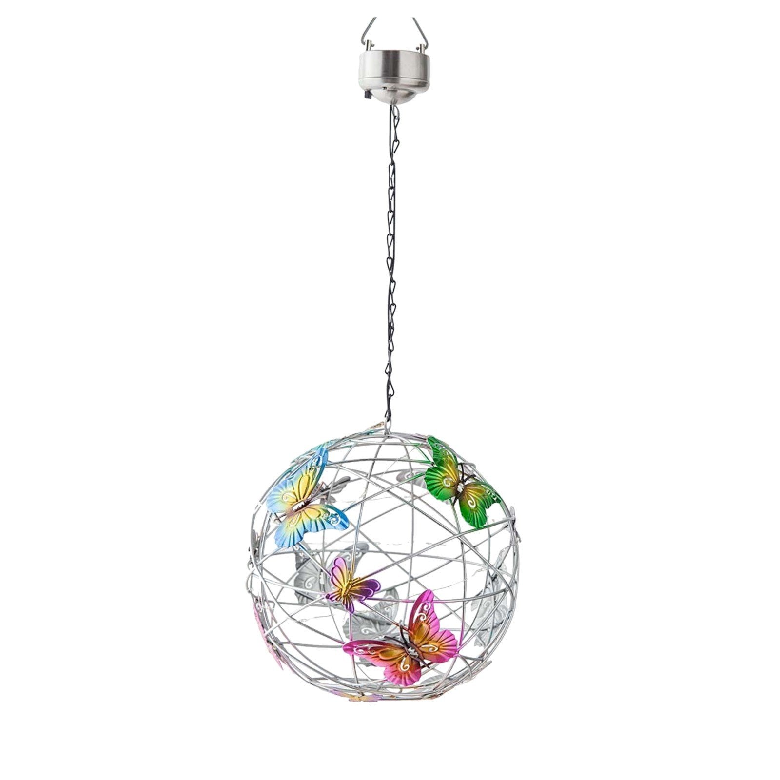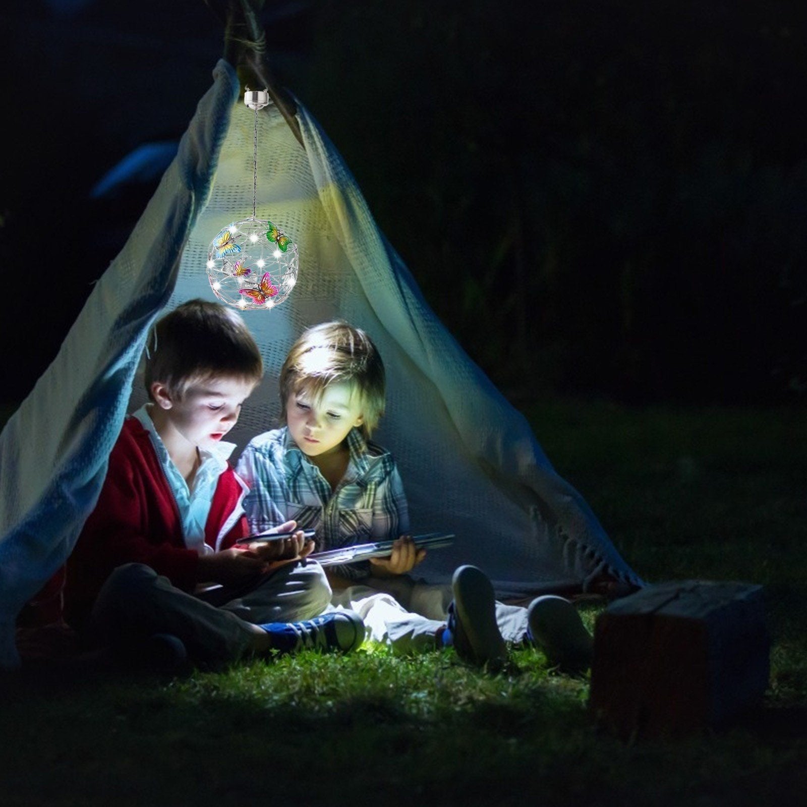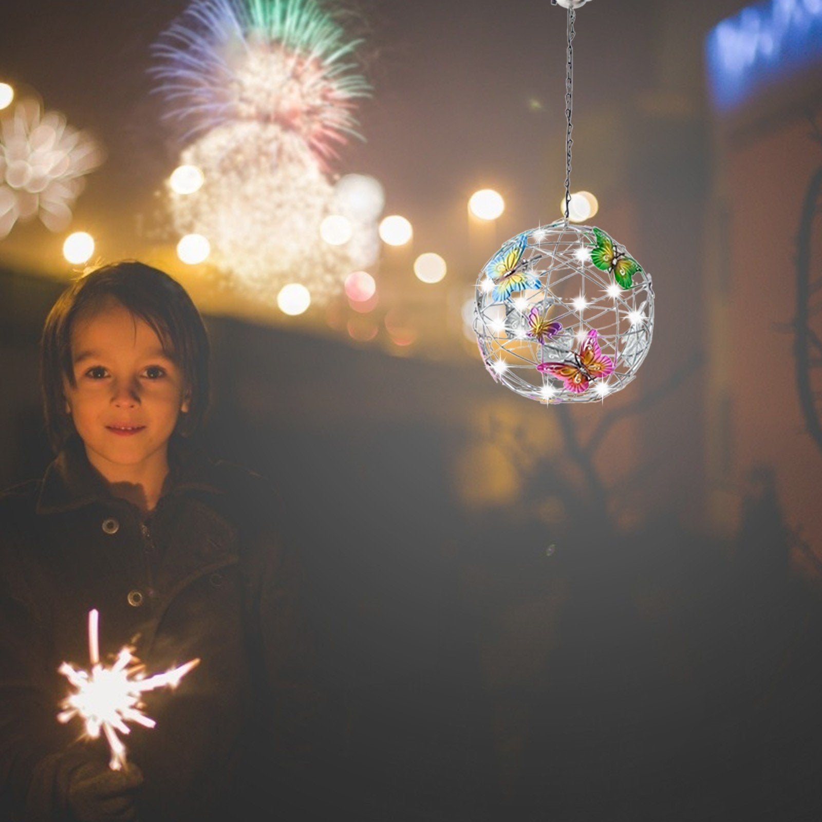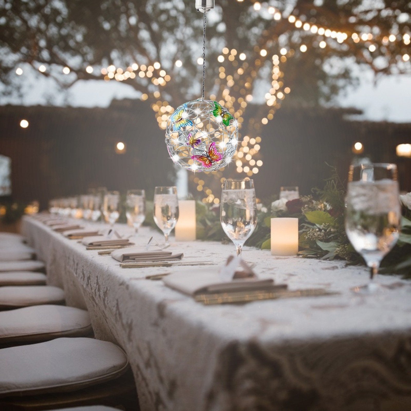- Върху металната топка има модели на пеперуди в различни цветове, след като се стъмни, низ от светлини осветява нощта, този специален дизайн ще създаде романтична атмосфера и ще обогати радостната ви атмосфера вътре и извън къщата Мир и красота. Използвайте тези светлини като парти, сватбена декорация или градинско парти.