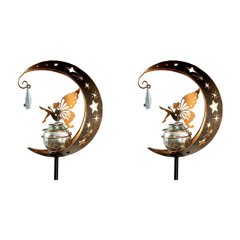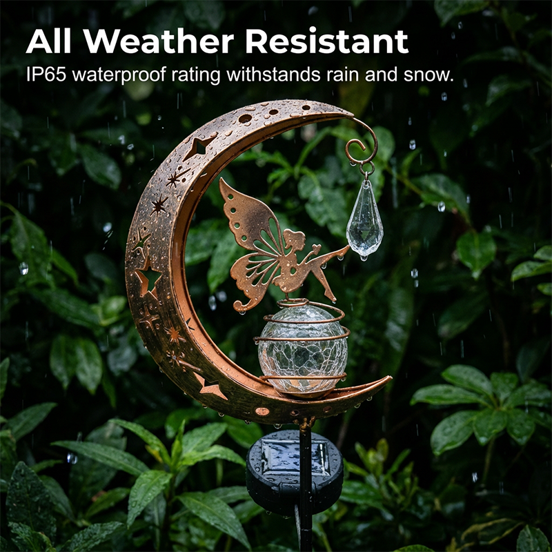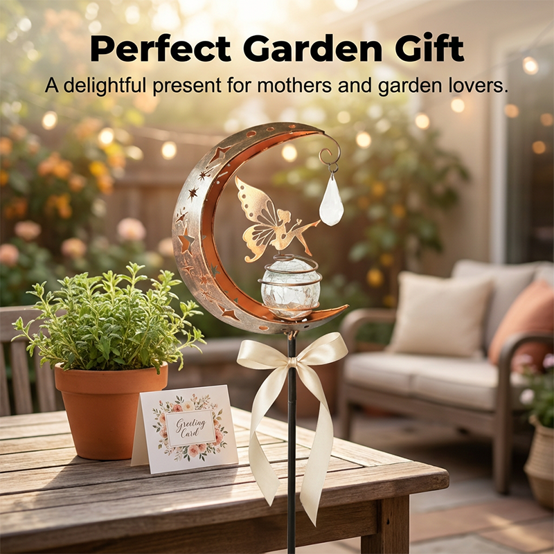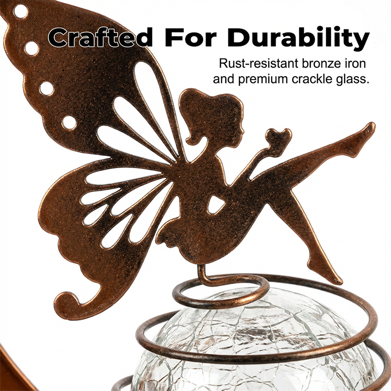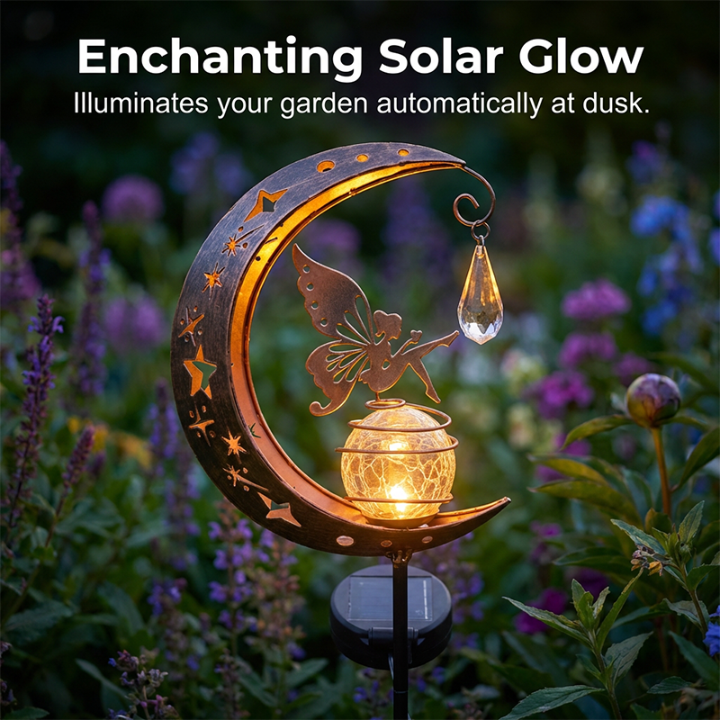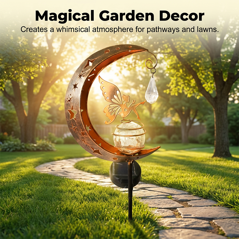 ОЧАРОВАТЕЛЕН ДИЗАЙН С ФЕИ И ЛУНА - Добавете малко магия към вашата градина. Тази уникална лампа е с деликатна фея, кацнала на пукнато стъклено кълбо, обрамчено от полумесец, създавайки приказна атмосфера като от приказка